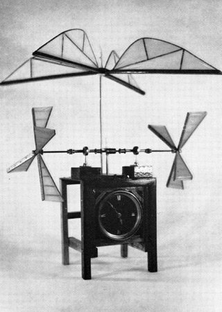 Cyrano de Bergerac fut un précurseur de la SF et plus généralement de la liberté de pensée, à une époque où il ne faisait pas bon avoir des idées personnelles… Une réalisation (librement interprétée… comme il se doit) de l'horloge à vent par Jacques Carelman (in Mécaniques pour Cyrano, Ed. du Dragon, 1965) :