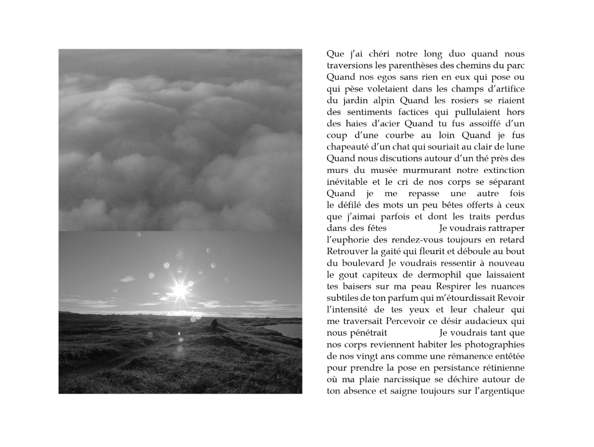 Je voudrais tant que  nos corps reviennent habiter les photographies de nos vingt ans comme une rémanence entêtée pour prendre la pose en persistance rétinienne où ma plaie narcissique se déchire autour de ton absence et saigne toujours sur l’argentique