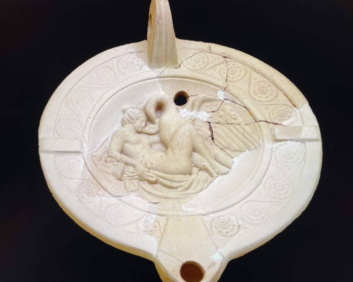 Léda et le cygne sur une lampe du III siècle ap. JC