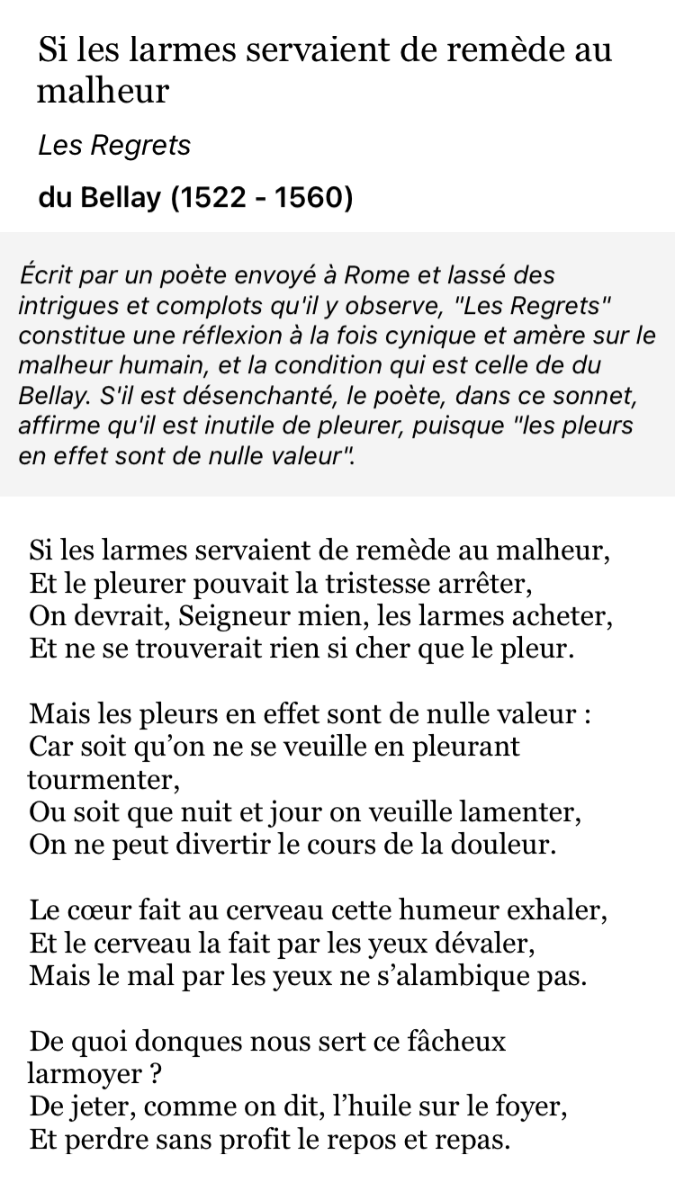 Belle transposition en langue moderne du sonnet de Du Bellay sur le thème: il est inutile de pleurer sur son sort.