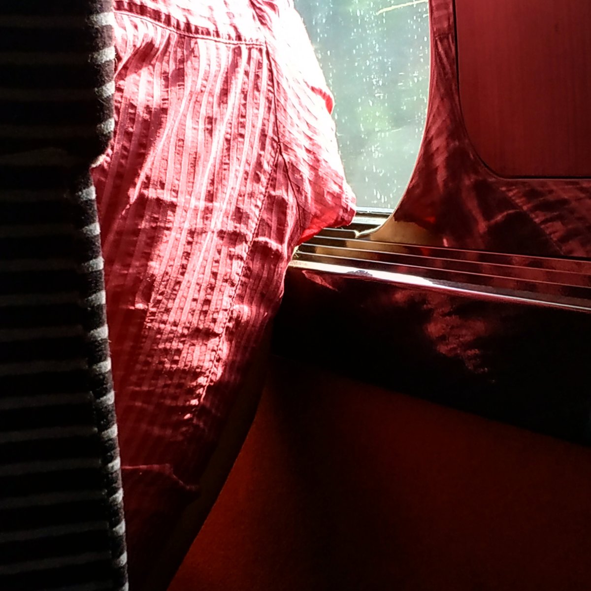 cet homme brun accoudé à la vitre d' un train ,son drapeau aux couleurs vert ,jaune et rouge se découperait magnifiquement dans un beau ciel nuageux.